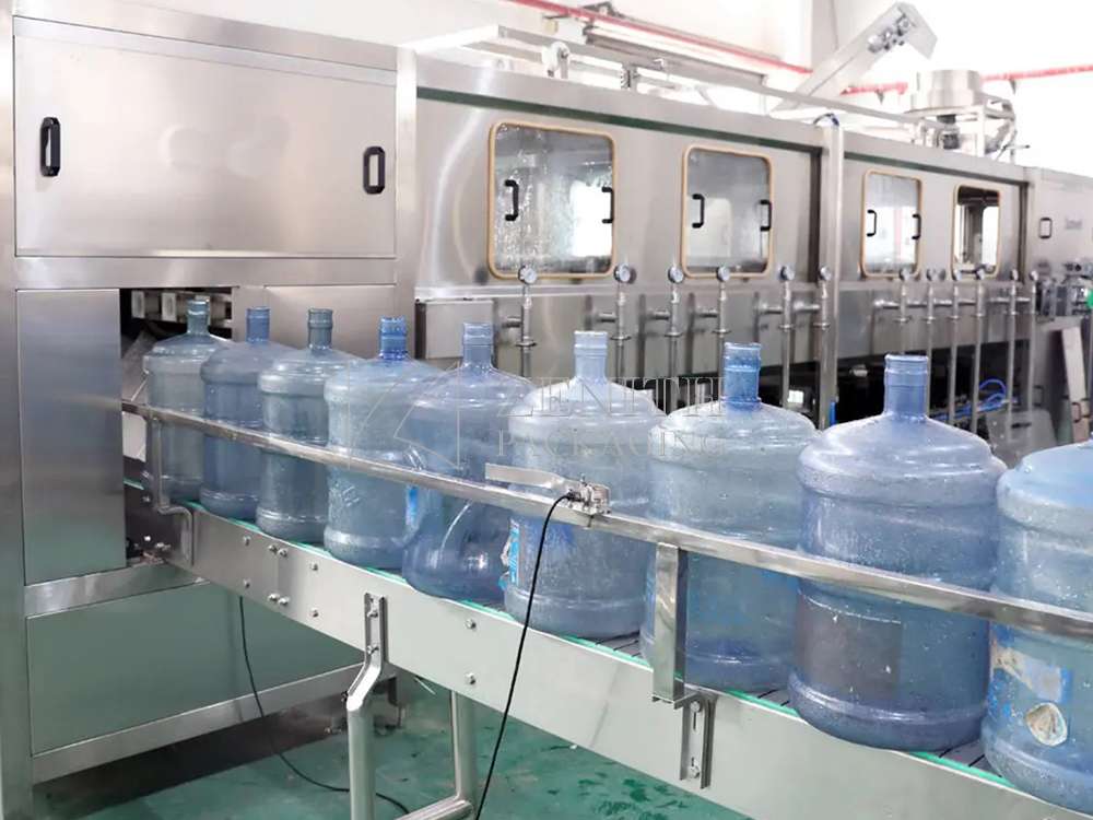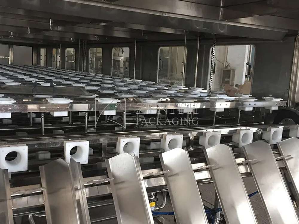 For the whole production line, which integrates automatic cap removal, bottle washing, automatic bottle loading, internal flushing system, filling, air conveying caps, capping, capping, heat shrinkable film, linear 5-gallon bottle lifter, bottle palletizer. The entire production process adopts closed operation, coupled with ultraviolet sterilization and ozone disinfection, to ensure that the entire washing and filling process fully meets the relevant standards and regulations of the national health department, and effectively prevents the possible occurrence of drinking water in the filling process.